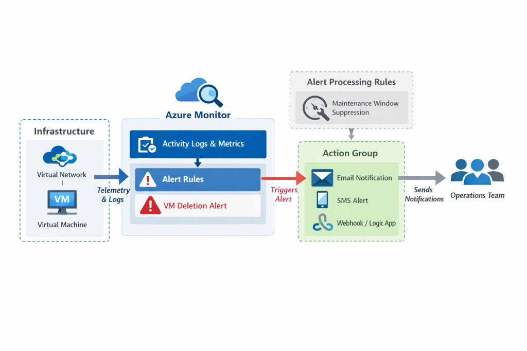 This hands-on guide demonstrates how Azure Monitor can be used to detect critical infrastructure changes, notify stakeholders, and reduce alert noise through processing rules. Applying these techniques helps organizations maintain visibility while keeping operations manageable.