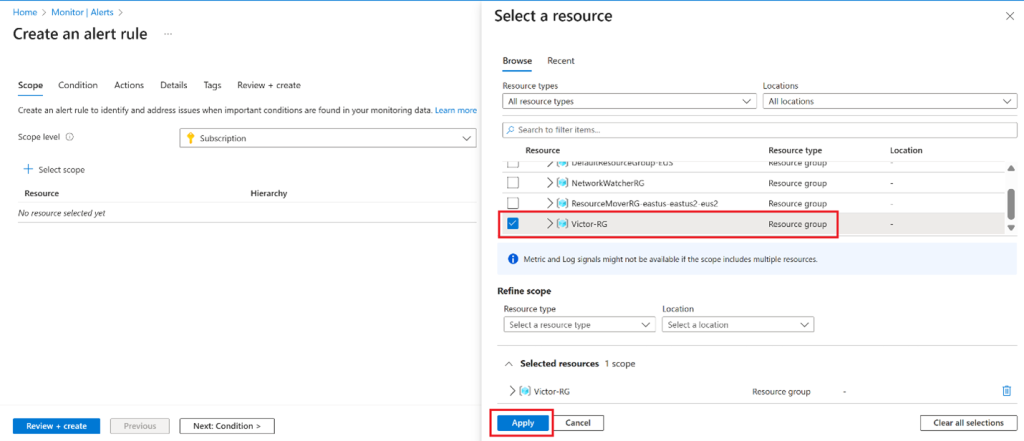 - Select the box for the subscription, then select Apply. This alert will apply to any virtual machines in the subscription.