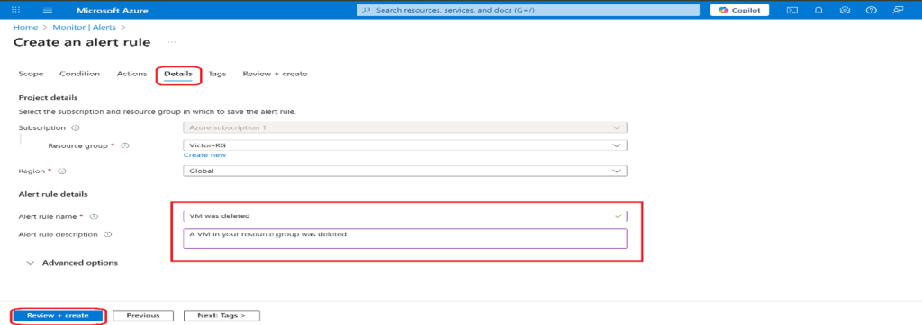 - Once the action group is created, move to the Next: Detailstab and enter the values for each setting.