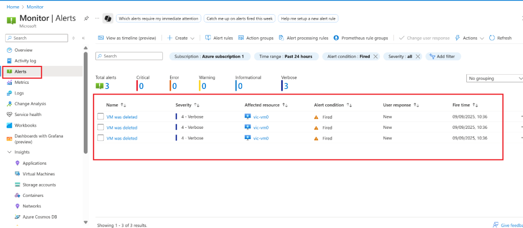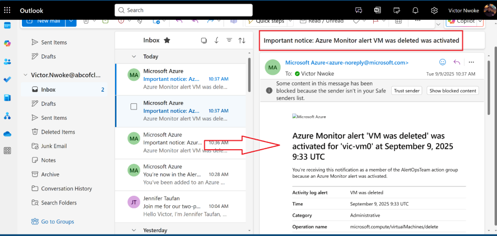 - You should receive a notification email that reads, Important notice: Azure Monitor alert VM was deleted was activated… If not, open your email program and look for an email from azure-noreply@microsoft.com.