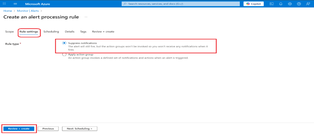 - Continue in the Alerts blade, select Alert processing rules, and then + Create.