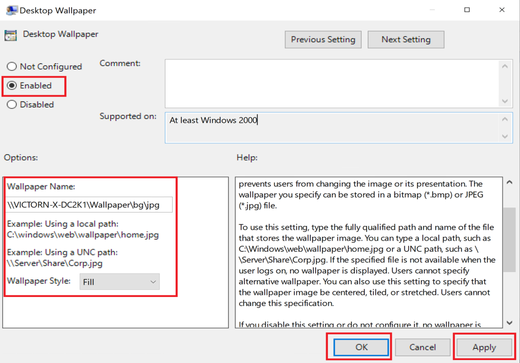 Set the image path (UNC recommended):\\DC01\Wallpapers\bg.jpg