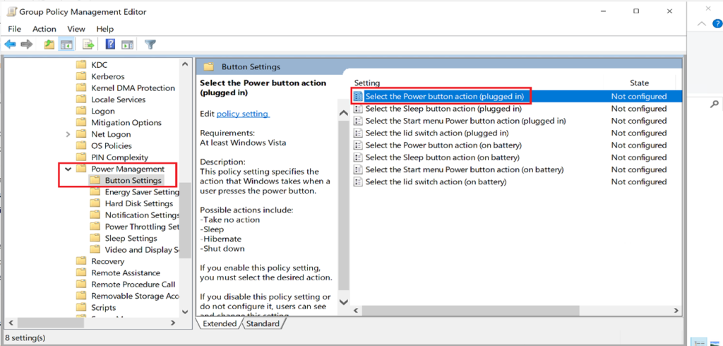 Computer Configuration → Administrative Templates → System → Power Management → Button Settings