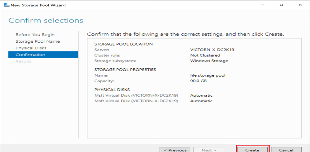Click Create to finalize the storage pool.