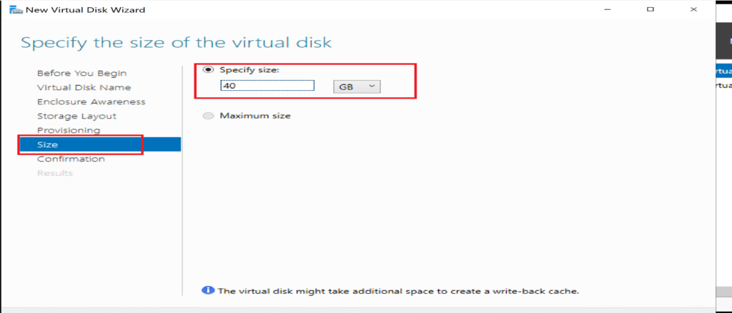 Set the disk size and complete the wizard to create the virtual disk.