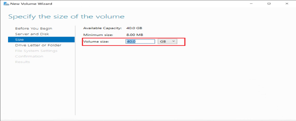 Specify the volume size.
