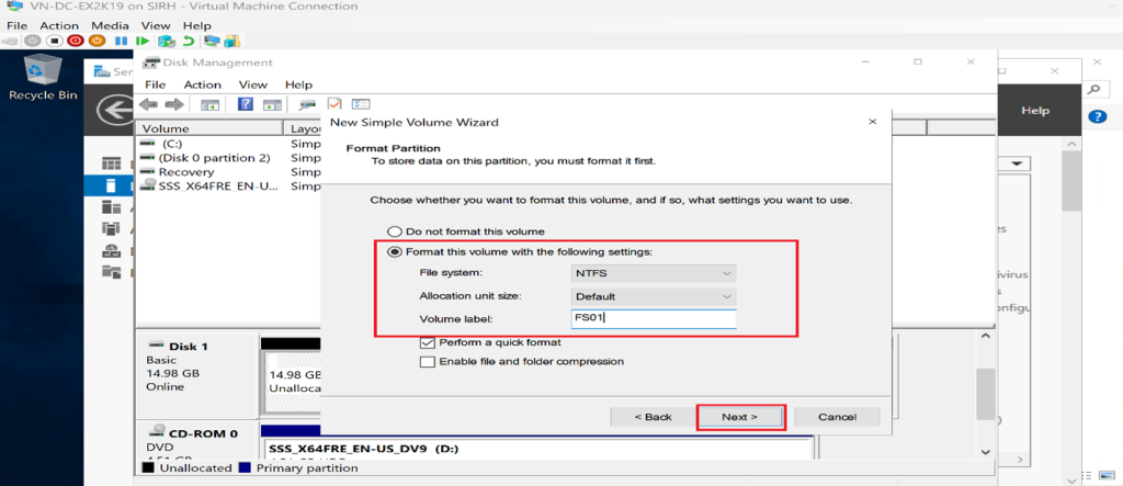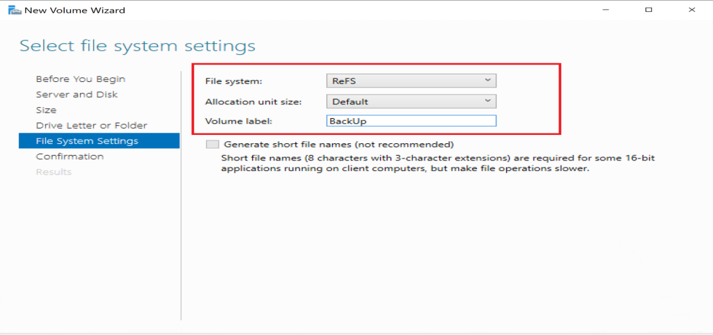 Choose a file system (e.g., NTFS or ReFS), allocation unit size, and provide a volume label.