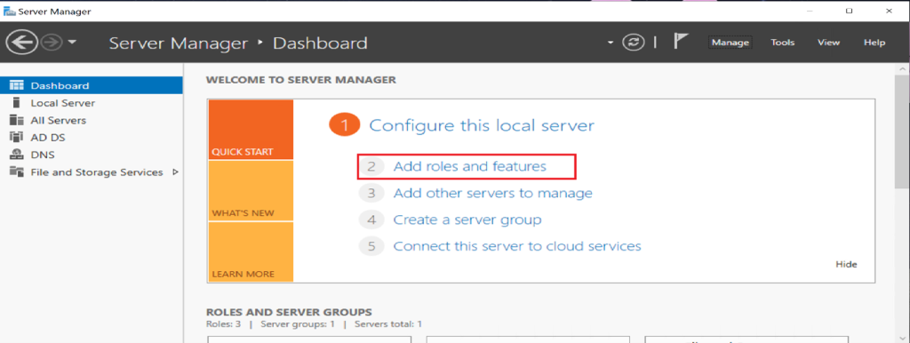 - Manage → Add Roles and Features