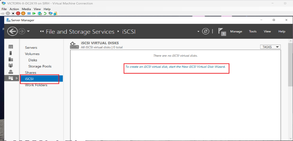 In Server Manager, go to File and Storage Services and click iSCSI.