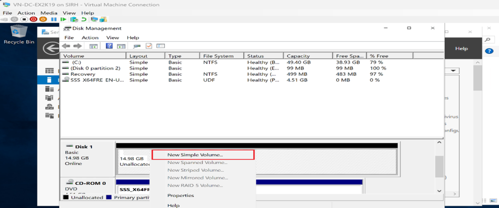 Still in Server Manager, after the disk is created, Click Tasks → New Volume