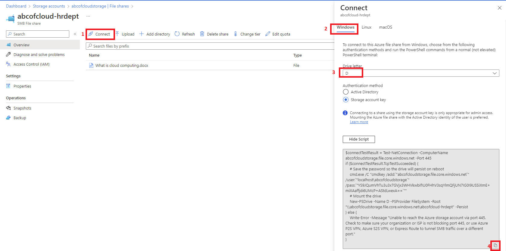 Step 2: Choose the Storage account key and copy the script that will be displayed to you.