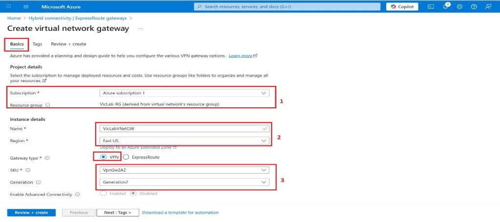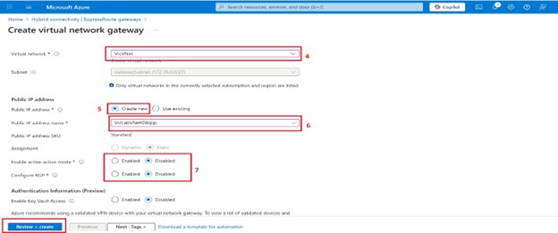 8. SKU will be VpnGw2AZ for this tutorial, I will be adding some links where you can learn more about the SKU, resizing, and zone redundant.