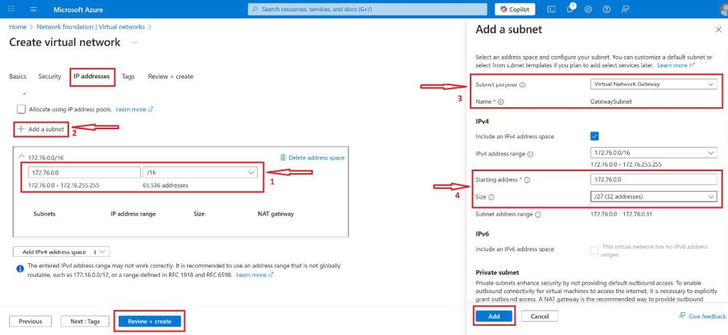 12. We will change the default Gateway subnet address range to 172.16.1.0/27 or larger which is (/26,/25,/24, etc.)ย Anything lesser will throw an error if youโre trying to deploy a zone-redundant/zonal gateway and also this allows enough IP addresses for future changes.