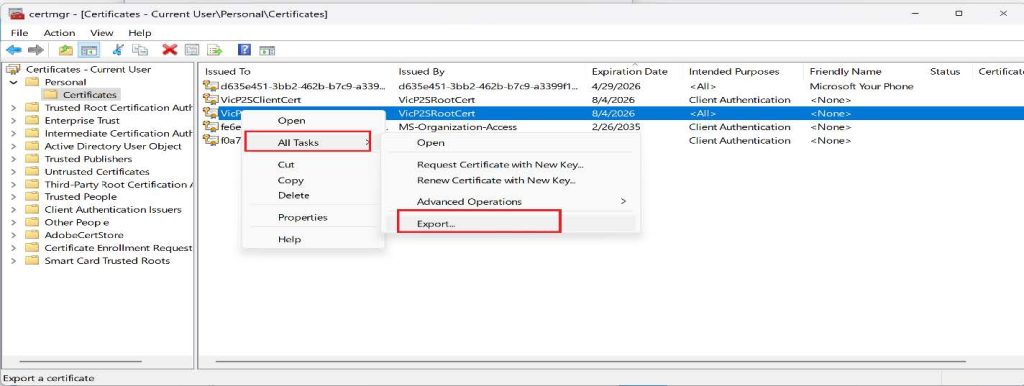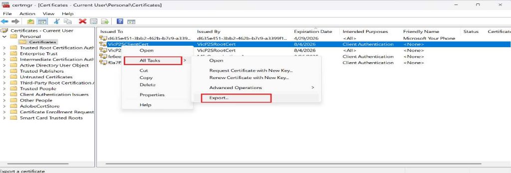 - Right-click on the client certi๏ฌcate and click on All Tasks, then click on Export