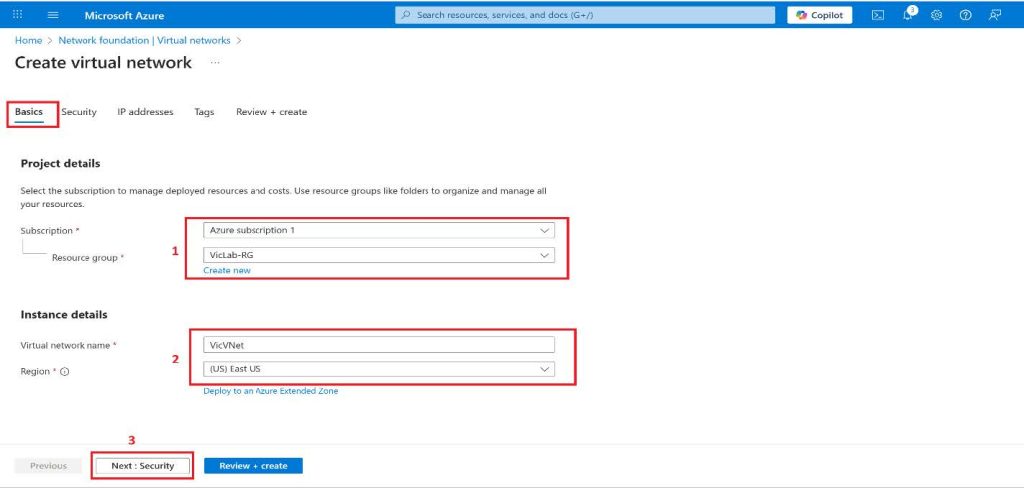8. Choose a preferred location for the Virtual Network, by clicking on the drop-down and selecting the region you prefer, and then click on next at the bottom. Note: The location determines where the resources that you deploy to this VNet will live.