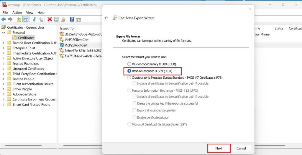 4. On the Export File Format page, select the Base-64 encoded X.509 (.CER), and then click Next.