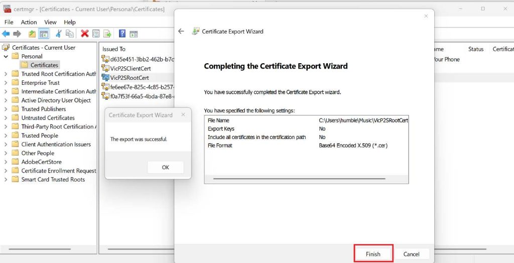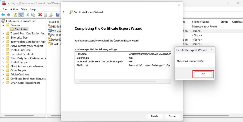 5. Browse the location you want to save it and then give it a preferred name then click Next, Click Finish to export the certificate to your preferred location. Youโll see a confirmation from a pop-up saying, โThe export was successfulโ.