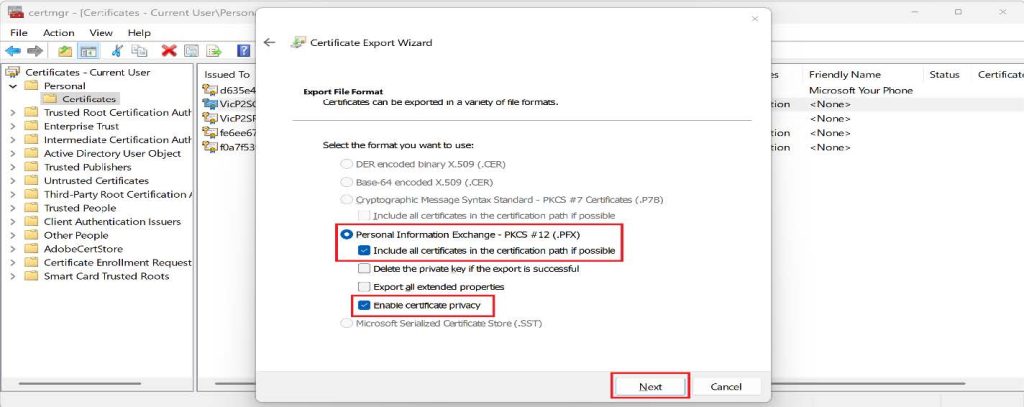 - Select Yes, export the private key, and then click Next.