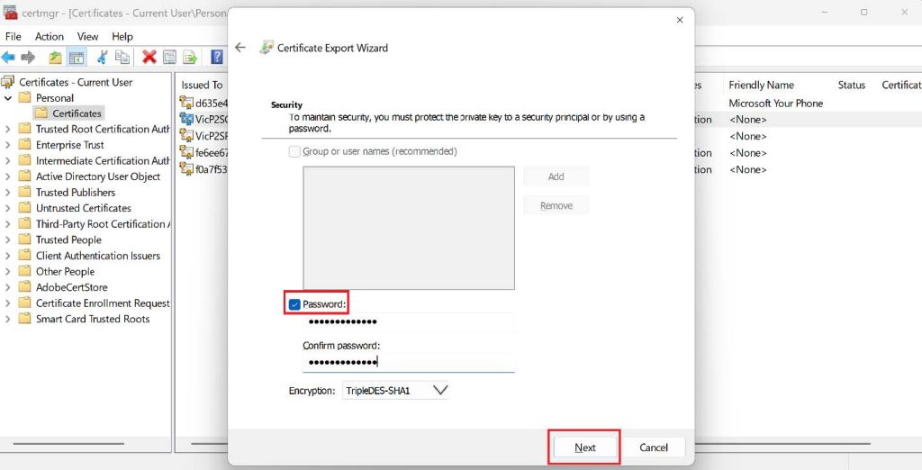 - Tick the Password check box on the Security page and type in your password.Remember, you will need this password if you are trying to connect with this certi๏ฌcate from another client.