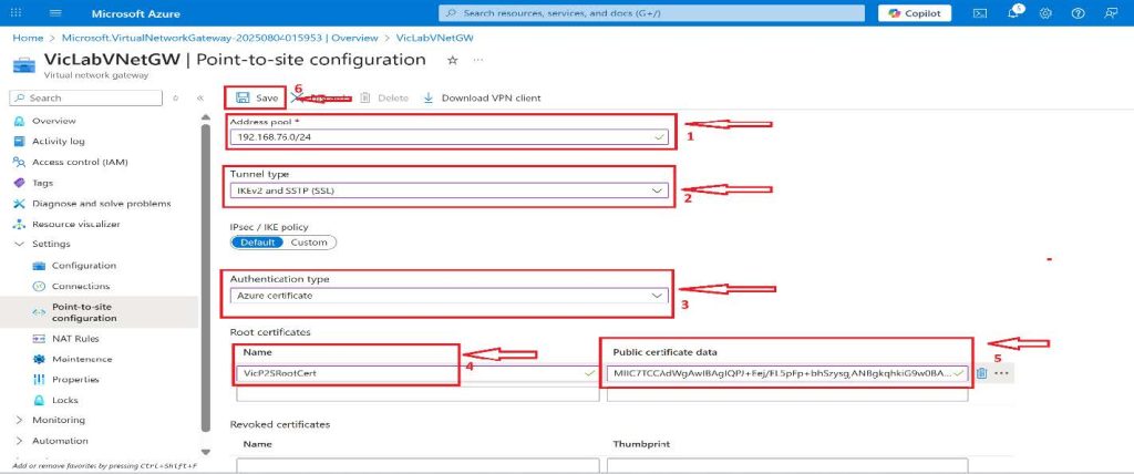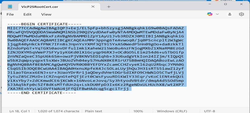- Under the Root certi๏ฌcates, select a preferred name for this project. I will be using VicP2SRootCert, and in the public certi๏ฌcate data, paste the text that you copied from the root certi๏ฌcate on our client computer, and click on Save at the top.