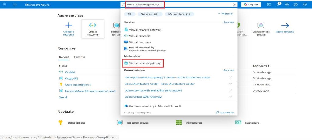 1. Search for Virtual network gateway in Azure portal.