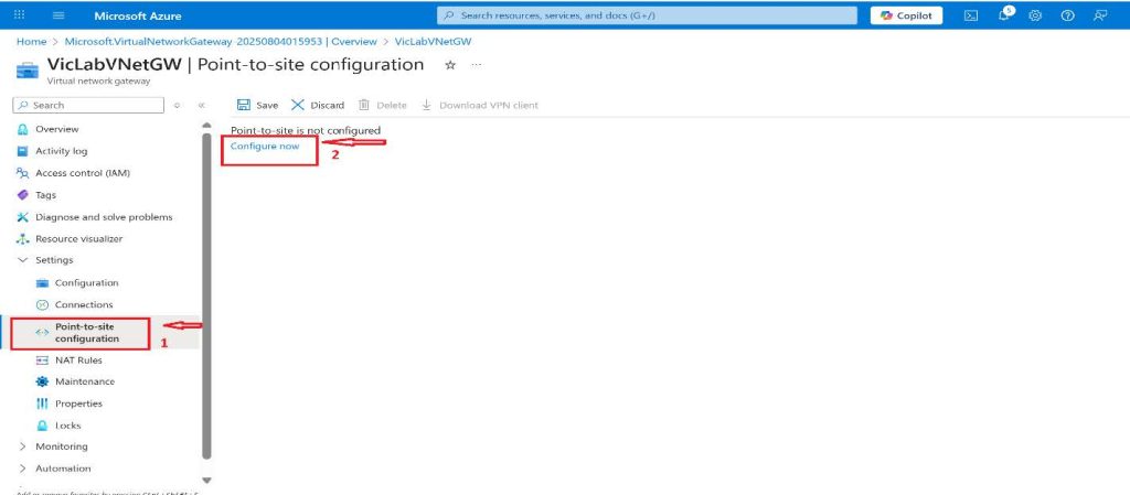 - On the Virtual network gateway page, click on the Point-to-site con๏ฌguration under Settings on the left side menu and then click on Con๏ฌgure now on the right.