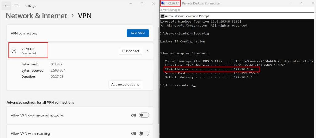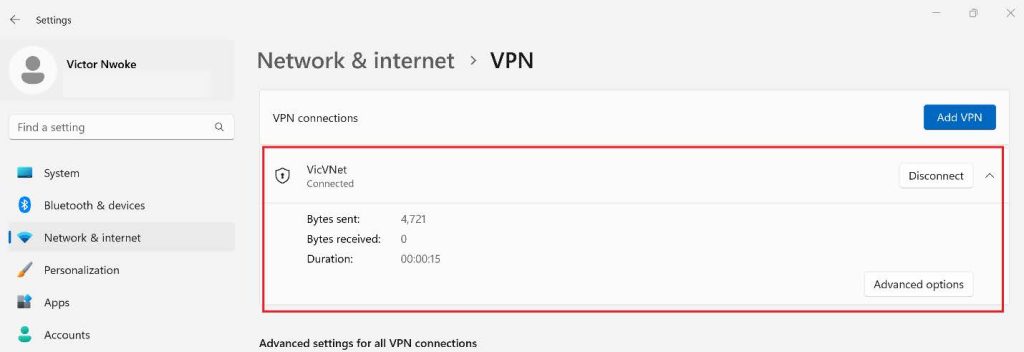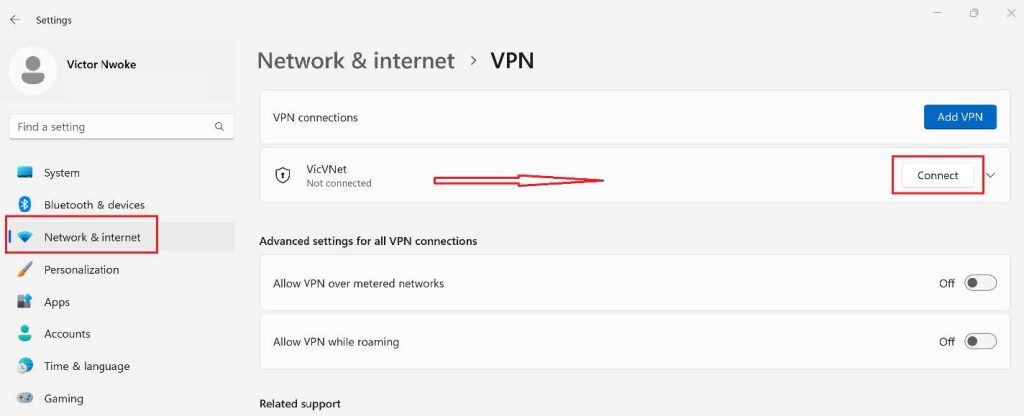 After installing the VPN client, go to Network and Internet in settings, then click on VPN, you should see the Virtual Network we created on Azure, click on it, then click on Connect.