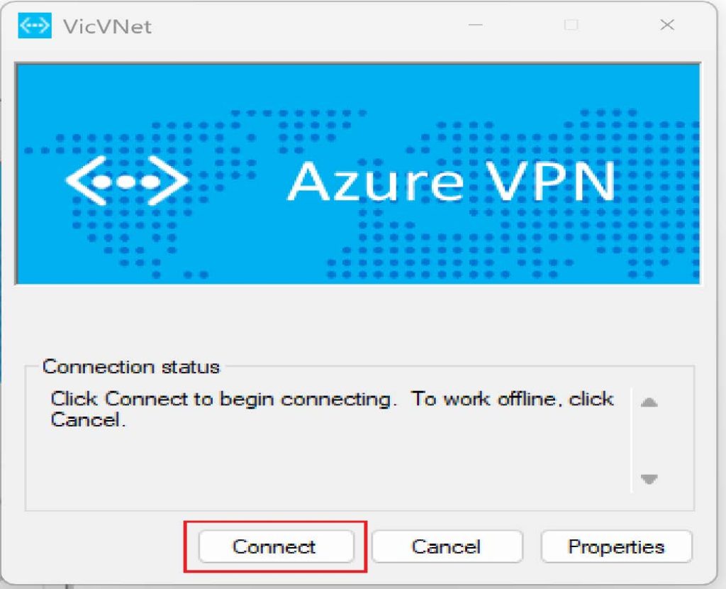 Once you click on the connect button the Azure VPN will pop up, then click on connect again.