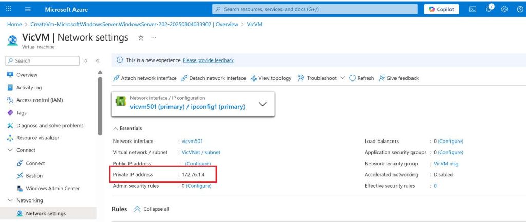 I went ahead to use Remote Desktop Connection to connect with the Virtual Machines using the Private IP : 172.16.0.4.