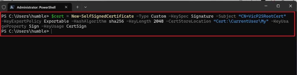 2. Copy and paste the cmdlet below on PowerShell. This cmdlet will create a self-signed root certificate named โabcofcloudP2SRootCertโ that is automatically installed in ‘Certificates-Current User\Personal\Certificates’. If you want to use your preferred name modify the CN value.