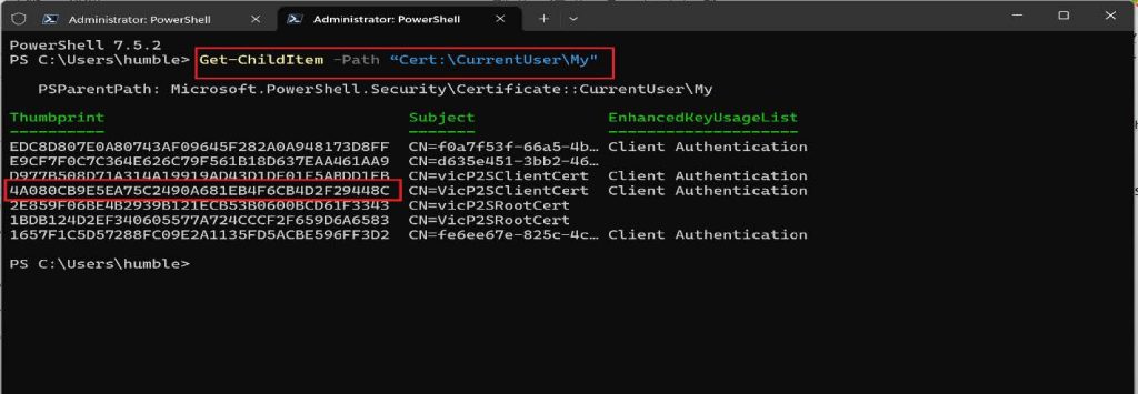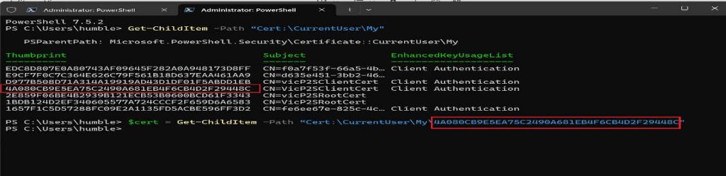 $cert = Get-ChildItem -Path โCert:\CurrentUser\My\4A080CB9E5EA75C2490A681EB4F6CB4D2F29448Cโ