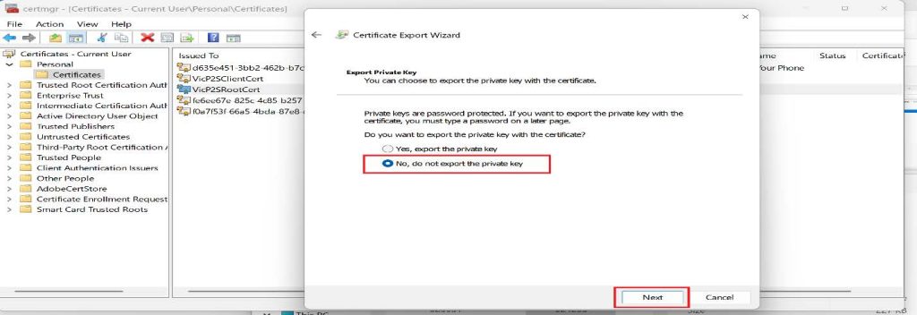 3. Click on Next on the Certificate Export Wizard, and Select No, do not export the private key, then click on Next.