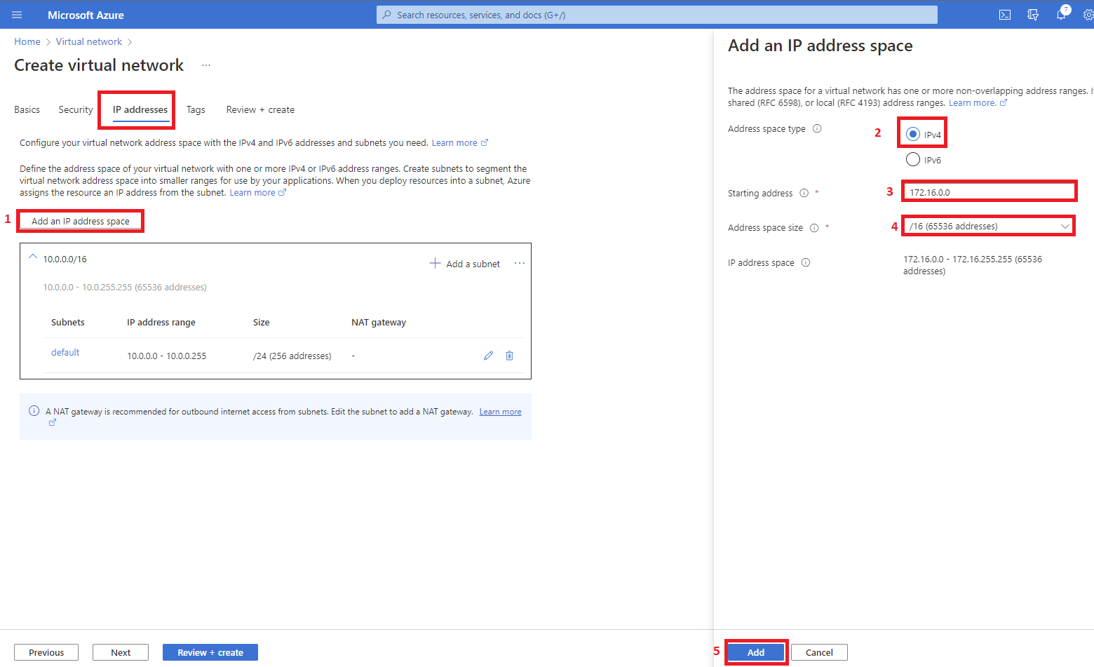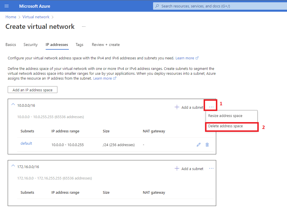 9. On the IP addresses tab click on the Add an IP address space and select the Address space type radio button for IPv4. Starting address type 172.16.0.0, Address space size use the drop-down to select /16 (65536 addresses) and click the Add button.