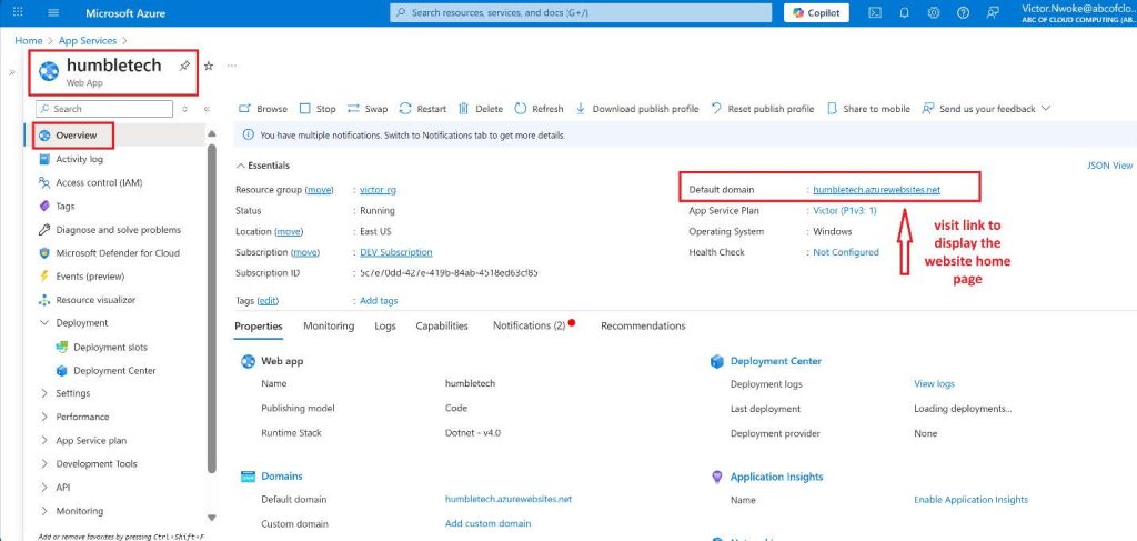 - On the blade of the newly deployed Web App, click the Default domain link to display the Default web page in a new browser tab.