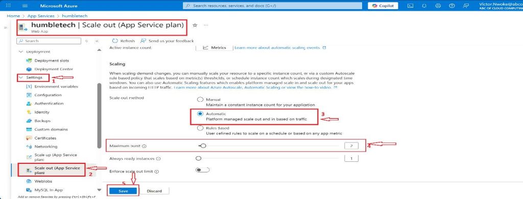 - In the Settings section, select Scale out (App Service plan).
