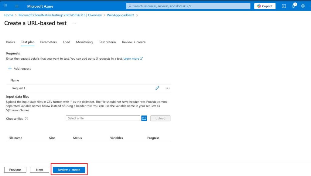 - Select + Create and give your load test a name. The name must be unique.
