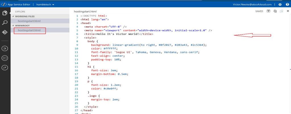 - In the App Service Editor, select hostingstart.html. Edit the default web page to your own. For this Demo, you can customize the web page. It is saved automatically.