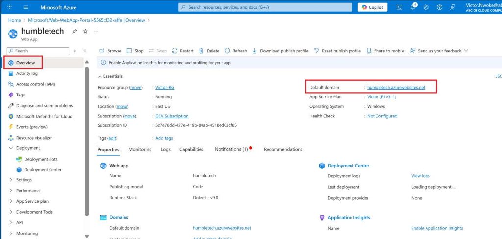 - On the blade of the newly deployed Web App, click the Default domain link to display the Default web page in a new browser tab.