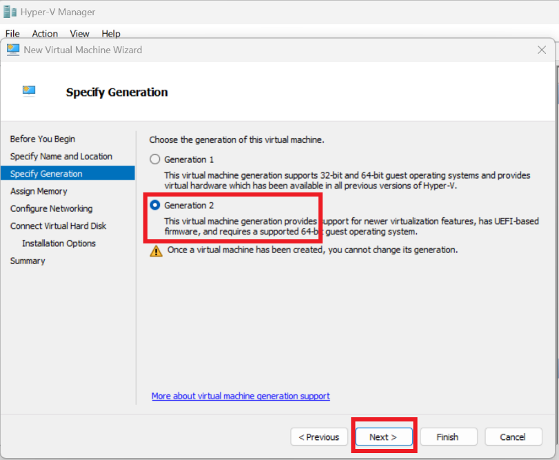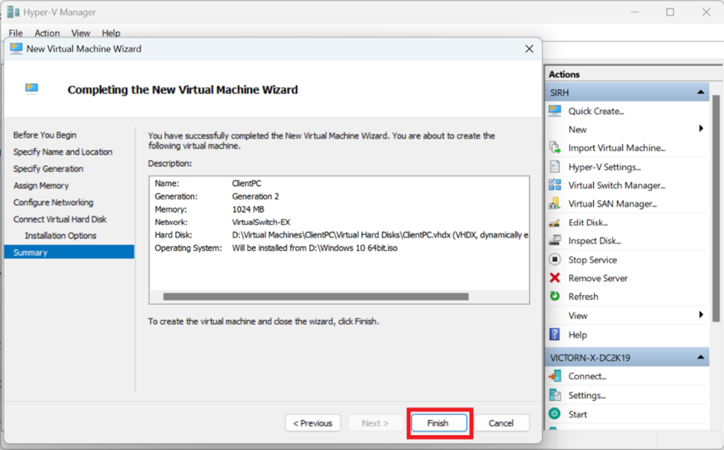 In Hyper-V Manager: Right-click on your host → New → Virtual Machine → Name your VM (e.g., “ClientPC”) → Choose Generation 2