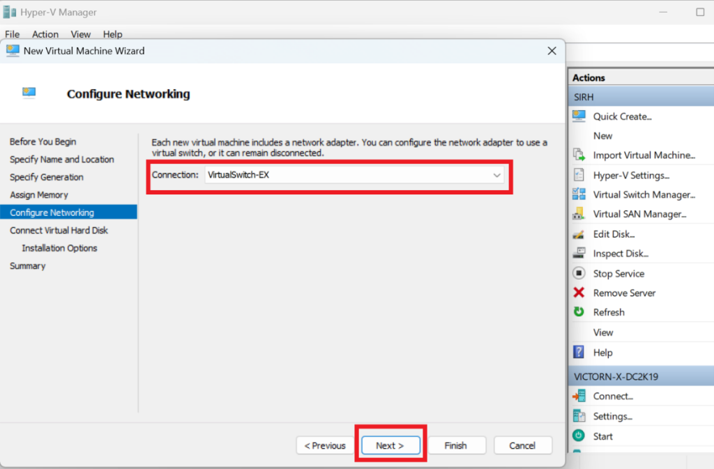 → Select and connect it to the same virtual switch as the Domain Controller for network visibility.