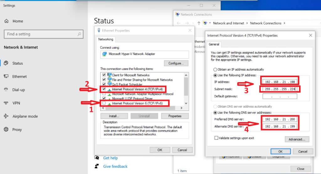 Untick Ipv6 → Double-click on Ipv4 → Set a static IP address