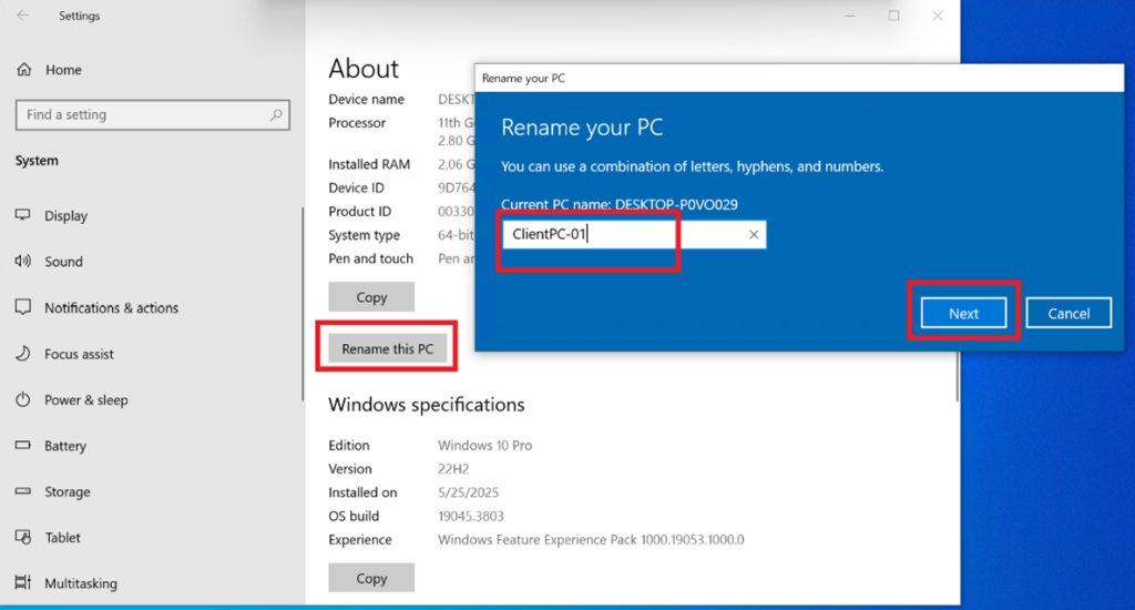 Opened System Settings → Changed PC name (ClientPC-01)