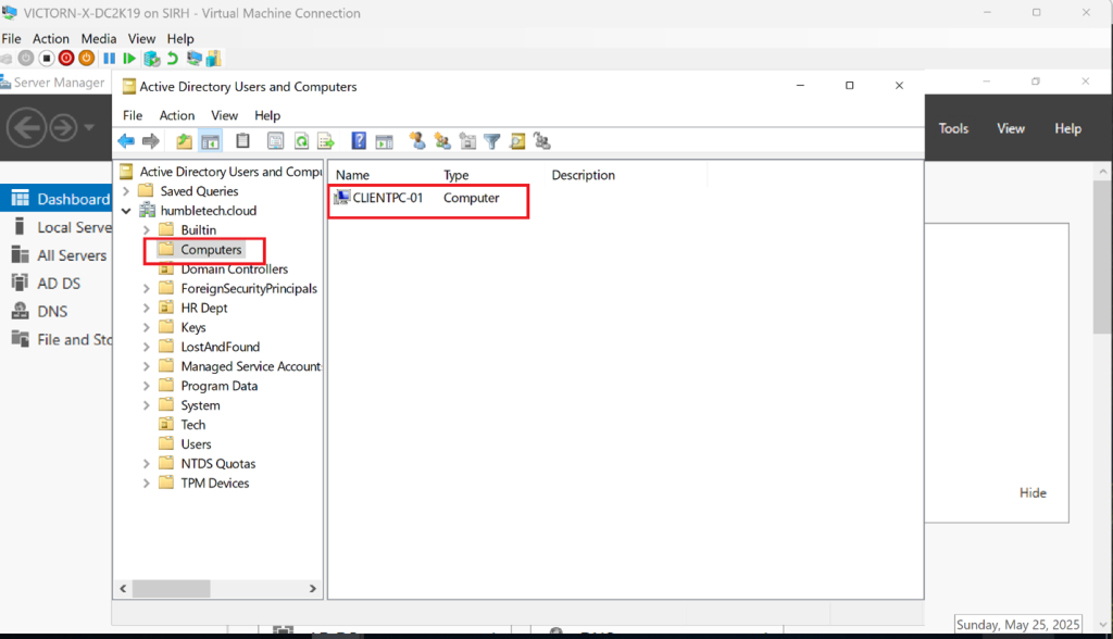 Confirmed in Active Directory Users and Computers (ADUC) that the machine appeared under Computers