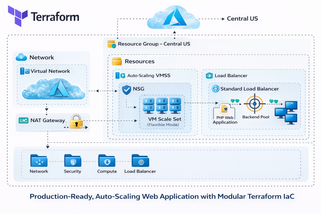 At the core of this project tutorial is a fully automated, auto-scaling Azure web application, deployed end-to-end using modular Terraform Infrastructure as Code.